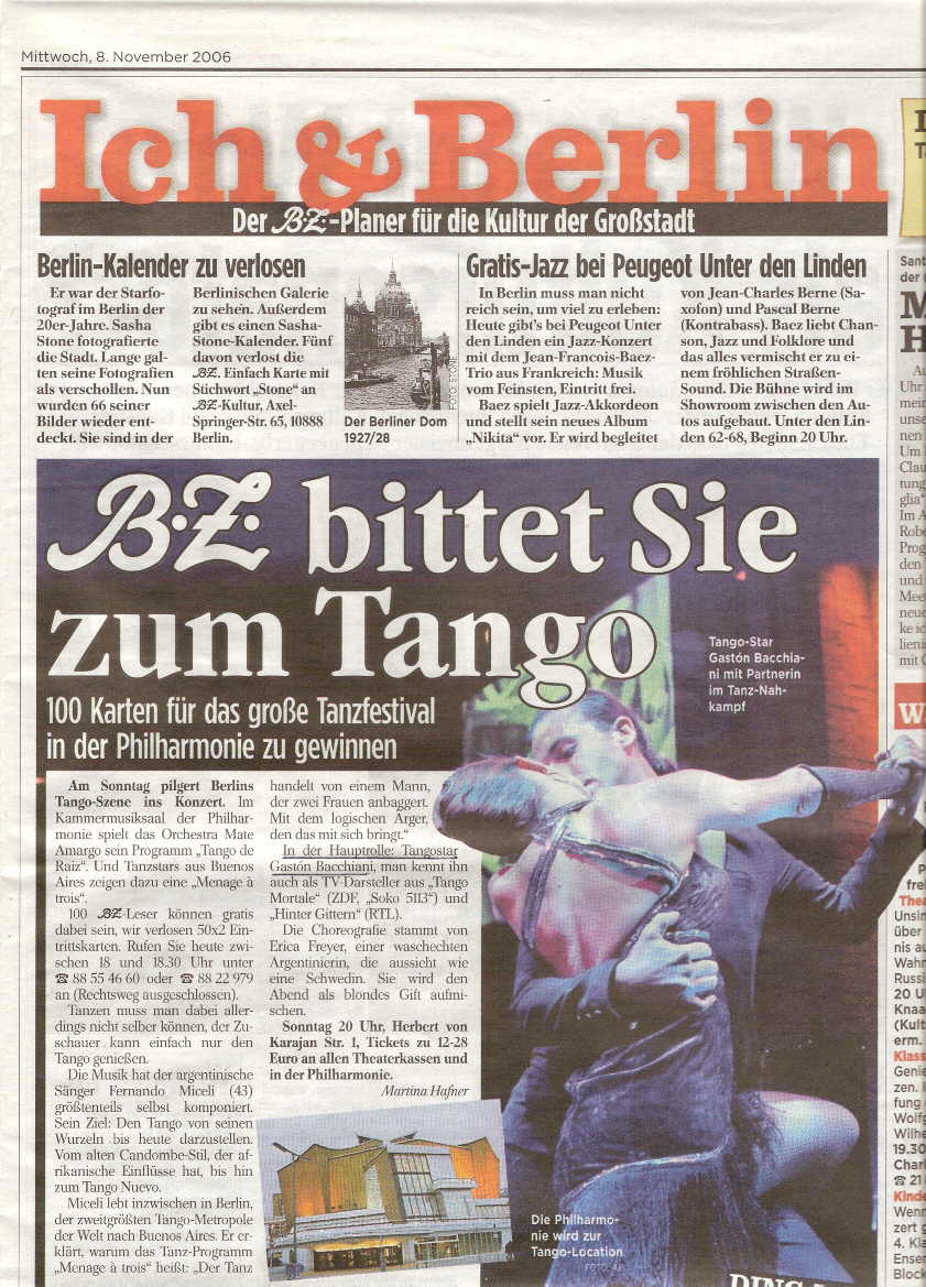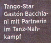Im Juli war Gaston Bacchiani in „Tango Mortale“ bereits als Krimi-Darsteller im ZDF zu sehen. Parallel dazu nimmt er intensiven Schauspielunterricht und hat eine eigene Buch- und Filmproduktion gegründet (www.gaston1.com). Jetzt kam die Zusage deutscher Produzenten, dass er 2006 die Hauptrolle in seinem ersten, eigenen Kinofilm spielen kann. Er erzählt die Geschichte eines Jungen, der aus Argentinien nach Deutschland kommt...